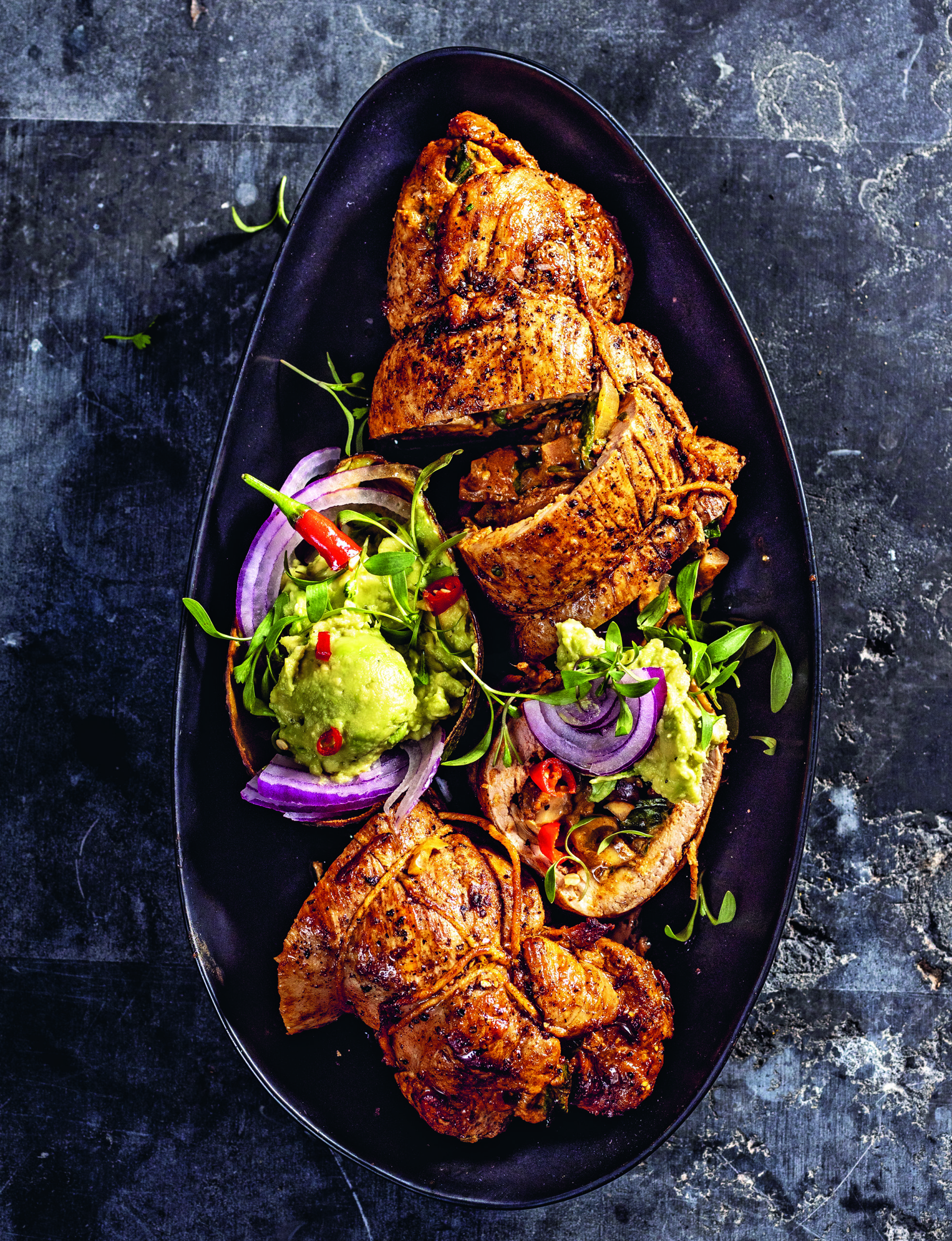 Lean pork fillet stuffed with apricots and sage, wrapped in bacon f...